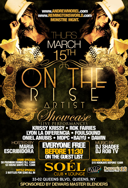 Remington’s World and Andrew Morel Productions along with Monstre MGMT will continue their Rising Icons series with the debut of the On the Rise Artist Black Carpet Showcase, a presentation of the best up-and-coming artists from different genres in the New York City area on Thursday, March 15th at Soél Club & Lounge in Queens. Sponsored by Dewar’s® Blended Scotch Whisky, the aptly named “On the Rise Artist Showcase” is designed to highlight unique and deserving acts amidst a host of music industry gatekeepers. The event will feature music by Lo Maximo Productions DJ Rob TV and the renowned Dewar’s MasterBlenders-DJ Shadee of Music Choice and Musica Urbana & Music Choice Mixtape Channels – and the Dewar’s models. The evening will also serve as the official farewell party for the Winter Music Conference. The semi-annual artist showcase will spotlight R&B singer Dawin, Pop/Electro/Crunk group MDPC, Latin Pop group Rok Ferries, Hip Hop artist Glamz, and Reggaeton artists Lyon La Diferencia and Oniel Anubis. Brooklyn’s own Dawin grew up in the midst of tropical sounds from his native country and the emerging pop artists of his time. The Dominican-American singer, songwriter, and producer was strongly influenced by music from Beyonce, Jay-Z, Ne-Yo, Alicia Keys, Michael Jackson, Biggie Smalls, James Brown to John Mayer and Juan Luis Guerra. MDPC quartet composed of Ralph, Will, Oz and Nick who work coherently alongside their co-producer Dawin bring their fun and energetic vibe to any performance. Their rich Dominican-Puerto Rican heritage combined with the gritty New York metropolitan has influenced their music with tropical rhythms as well as a touch of emerging underground sounds. Will and Dawin have been producing and writing for other acts while N Breeze, Spudz, and Oz have been lighting up the club scene with their DJ/MC skills. MDPC has recently gained international recognition in London and Australia with recent collaborations with electronic music producers Larry Tee and Stafford Brothers.