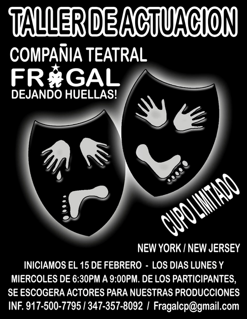 Las clases son de 6:30 (llegada) 6:45 a 7:45 Historia del Teatro y lectura, vocalizacion y diccion. 7:45 a 8:00pm Break y de 8 a 9:00pm. Expresion Corporal, sentimientos y emociones, desplazamientos y ejercicios. Llevar ropa comoda. Los interesados pueden llamar al 917-500-7795.