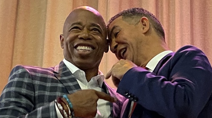 Eric Adams, a la izquierda, escucha muy de cerca a Ydanis Rodríguez. Foto Javier Castaño